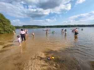 A beautiful lakeside beach with good swimming within a marked area and nice walks nearby. Note that this can get very, very busy on hots...
